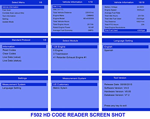 -. Feature : Scan heavy-duty trucks by J1939 and J1708 / Scan truck ECU components to read all DTC, clear Code and show live data. / The components are including Engine, Transmission, Brake, Turbo charger, Axle, Power unit, Trailer, Instrument cluster and much more / OBD16 via diesel 6pin or diesel 9pin connectors / 2nd generation of F502 HD code reader