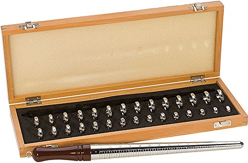 A complete set to accurately size rings. Be assured of giving your customers an accurate fit every time with this ring and finger gauge set which has been matched in graduated and full sizes from 1-15. Includes a metal ring stick with wood handle and 29 iFeature
