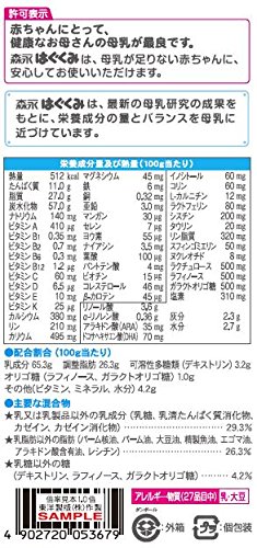 原材料:ホエイパウダー(乳清たんぱく質)、調整脂肪(パーム核油、パーム油、大豆油)、乳糖、脱脂粉乳、乳清たんぱく質消化物、デキストリン、バターミルクパウダー、乳糖分解液(ラクチュロース)、カゼイン、ガラクトオリゴ糖液糖、ラフィノース、精製魚油、アラキドン酸含有油、カゼイン消化物、食塩、酵母、L-カルニチン、炭酸カルシウム、レシチン、塩化マグネシウム、ビタミンC、ラクトフェリン、クエン酸三ナトリウム、リン酸水素二カリウム、コレステロール、塩化カルシウム、イノシトール、ピロリン酸第二鉄、ビタミンE、タウリン、硫酸亜鉛、シチジル酸ナトリウム、ビタミンD3、パントテン酸カルシウム、ニコチン酸アミド、ウリジル酸ナトリウム、ビタミンA、硫酸銅、5'-アデニル酸、イノシン酸ナトリウム、グアニル酸ナトリウム、ビタミンB6、ビタミンB1、葉酸、β-カロテン、ビタミンB12