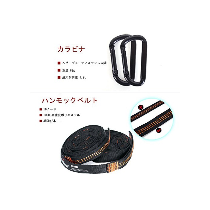 【사양】사이즈:약320×200cm(2-5명 용,신장은 180cm이상의 사람도 향해 있습니다.)무게:1170g,【수납 시 사이즈】약12cm * 13cm * 21cm【내하중】350kg「해먹(hammock) 본체:350㎏고, 벨트:700㎏고, 카라비너:1200㎏」 【소재】나일론100% 【부속품】 2*D형 카라비너,2*노드 타입 벨트,1*수납 대부속.【보증기간】보증기간은 수매 일부터1년간입니다.완전 환불 보증이 붙어 있음에서 안심입니다.
