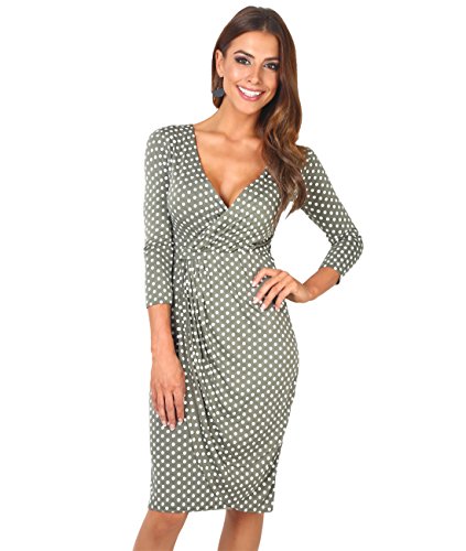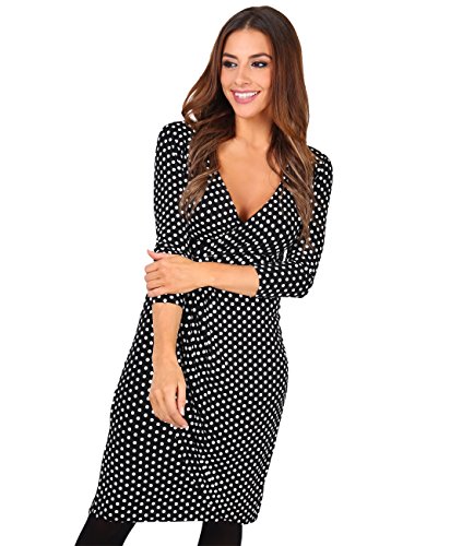 Lovely soft stretch jersey polka dot patterned midi dress made from viscose material, low cut V-neck, 3/4 sleeves, crossover front design.