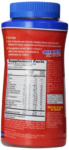 -. Binding : Health and Beauty -. Brand : Nature Smart -. EAN : 0759427526661 -. Feature : 0 grams of sugar. / B Vitamins help support Energy Metabolism.* / Vitamin C helps support immune function.* / Vitamin D3 helps support bone, teeth, and immune system health.* / Provides essential vitamins and minerals for your child's healthy growth and development with the sugar / These gummies contain vitamin A for eye health, b vitamins for energy metabolism, vitamin C for immune function, and vitamin D to support bone, teeth, and immune system health / These statements have not been evaluated by the food and drug administration / This product is not intended to diagnose, treat, cure or prevent any disease -. IsAdultProduct : 0 -. Label : Disney -. Manufacturer : Disney -. Model : AUS-356 -. MPN : AUS-356 -. NumberOfItems : 1 -. PackageQuantity : 1 -. PartNumber : AUS-356 -. ProductGroup : Health and Beauty -. ProductTypeName : HEALTH_PERSONAL_CARE -. PublicationDate : 2013-08-04 -. Publisher : Disney -. ReleaseDate : 2013-08-01 -. Studio : Disney -. Title : Disney Sugar-Free Complete Multi-Vitamin Gummies, 180 Count -. UPC : 759427526661