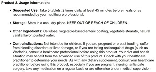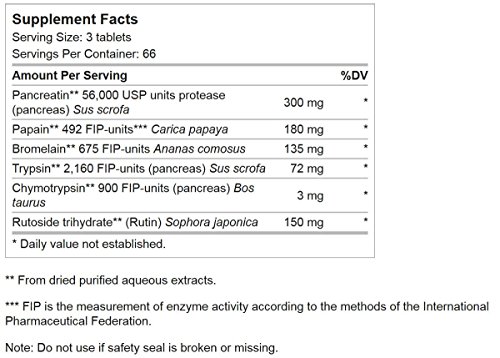 Wobenzyme N 200 tabs Dietary Supplement - Supports the Immune System - All natural active ingredients - Wobenzyme N is backed by decades of clinical research Supplement Facts Serving Size: 3 tablets Servings per Container: 66 Amount per Serving Pancreatin** 300 mg -56000 USP units protease (pancreas) Sus scrofa Papain** 180 mg -492 FIP-Units*** Carica papaya Bromelain** 135 mg -675 FIP-units Ananas comosus Trypsin** 72 mg -2160 FIP units (pancreas) Sus scrofa Chymotrypsin** 3 mg -900 FIP-units (pancreas) Bos taurus Rutoside trihydrate** 150 mg -(Rutin) Sophora janoica **From dried purified aqueous extracts. ***FIP is the measurement of enzyme activity according to the methods of the International Pharmaceutical Federatin. Other Ingredients: cellulose vegetable-based enteric coating vegetable stearate natural vanilla flavor purified water This product does not contain yeast gluten soy milk/dairy sodium sugar artificial coloring or preservatives. Suggested Usage: Take three (3) tablets two (2) times daily at least 45 minutes before meals or as recommended by your healthcare professional. Warning: If you are pregnant or breast feeding suffer from bleeding disorders or liver damage or if you are taking anticoagulants drugs (such as warfarin) consult a healthcare professional before using this product. Store in a cool dry place. *This statement has not been evaulated by the Food and Drug Administration. This product is not intended to diagnose treat cure or prevent any disease.Feature
