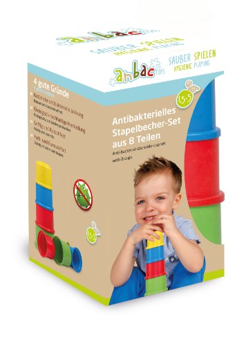 The colorful, Anbac Stacking Cup Set is a bacteria-resistant, 8-Piece stackable cup set. Stacking cups help to develop motor skills and understanding of color, while the naturally effect, due to innovative and exclusive material mixture of plastic and sustainable pine wood, creates a self-cleaning effect. The stacking cups from the anbac toys series from Eitech are germ-free within 8 hours. By contrast, bacteria can still be found on all other synthetic materials for up to 24 hours. Perfect for taking to kindergarten, bridge waiting times at the doctor or go on a long trip with the train or plane. Here, the self-cleaning effect is particularly practical. Made in Germany.Feature