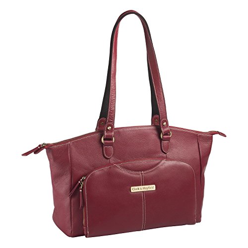 -. Brand : Clark & Mayfield -. Department : womens -. Feature : Fits up to 14.1 laptops / Soft, top-grain leather / Comfortable cotton-webbed straps / Easy-access zippered top / Strap for rolling lage on back -. Label : Clark & Mayfield -. Manufacturer : Clark & Mayfield -. PackageQuantity : 1 -. ProductGroup : Apparel -. ProductTypeName : LAGE -. Publisher : Clark & Mayfield -. Size : One Size -. Studio : Clark & Mayfield -. Title : Clark & Mayfield Alder Leather 15.6 " Laptop Handbag