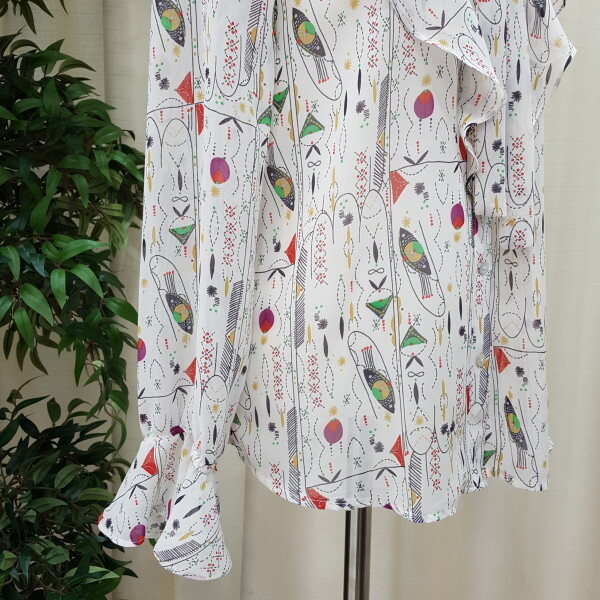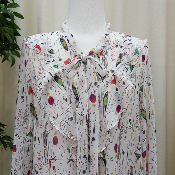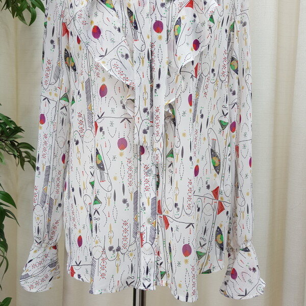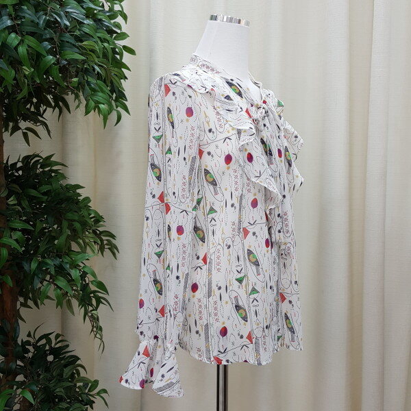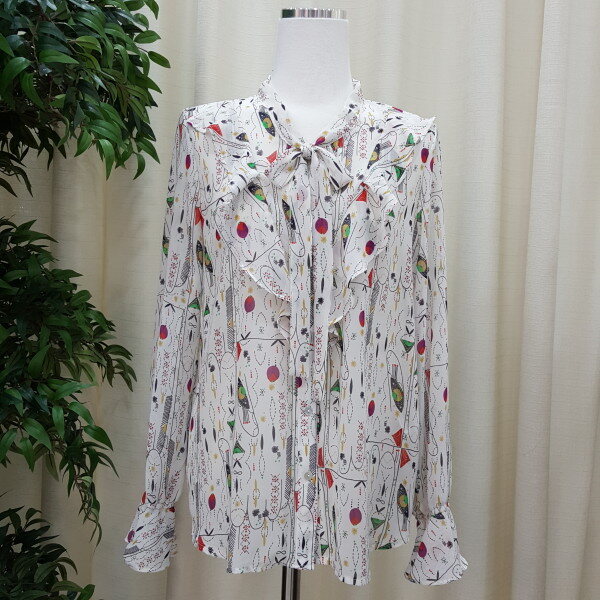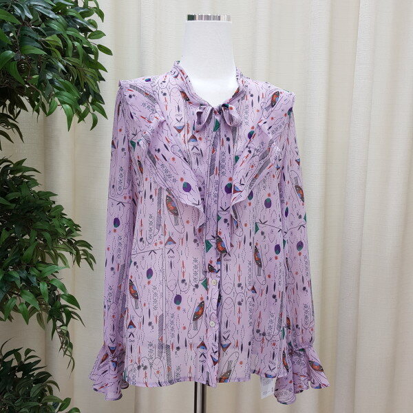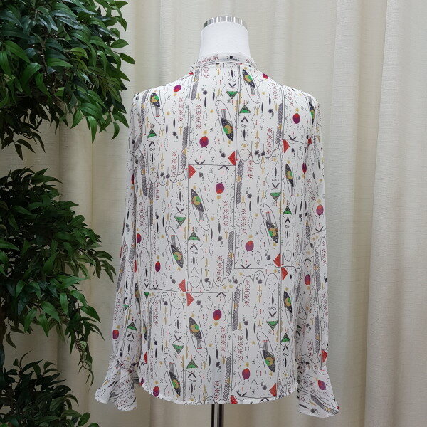 천안모다아울렛 멜로디가든 2018년 봄신상 기하학적 패턴 블라우스입니다소매 프릴이 귀엽고 앞 리본과 프릴이 깔끔한 스타일의 블라우스입니다 기하학적 패턴이 세련된 스타일의 제품입니다
