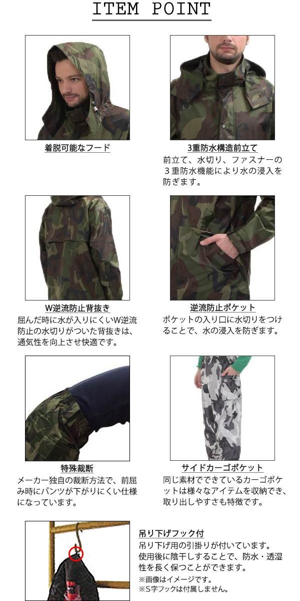 | 仕事でもアウトドアでも使える抑えめのカモフラ柄で、デザイン性と機能性を兼ね備えたレインウェアです。 |