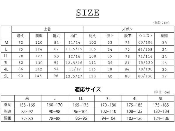 | 仕様 | 上下セット 男女兼用 ポケット付(上着両脇2箇所、パンツ両脇2箇所) 吊り下げフック付(上着のみ) 収納袋付 |