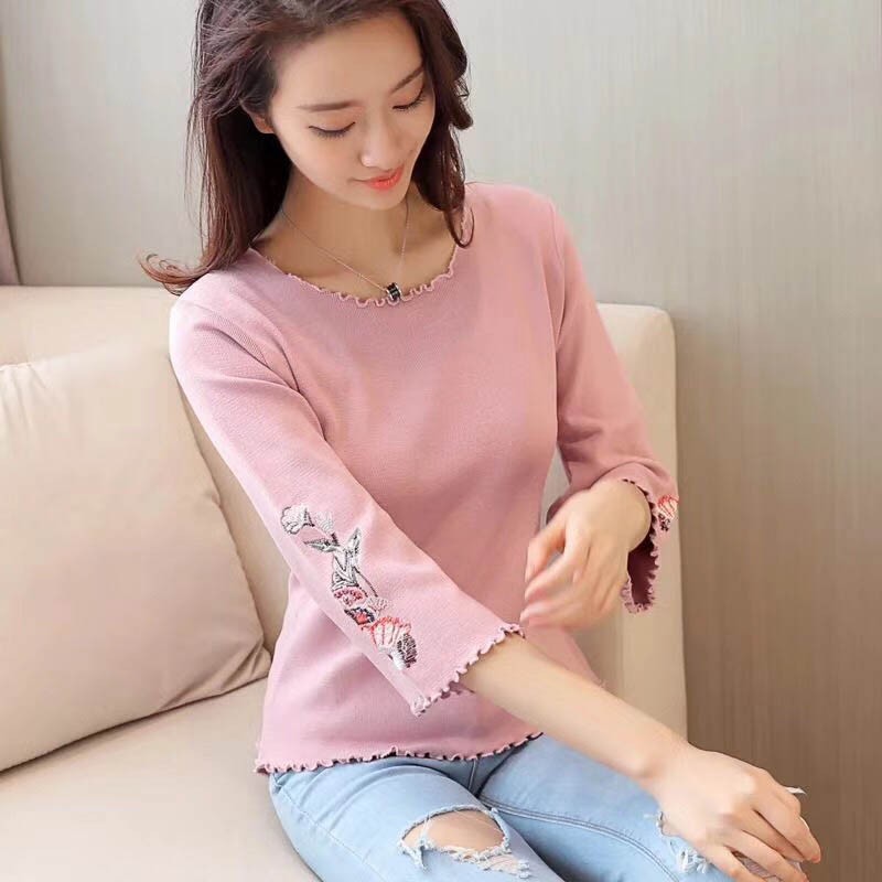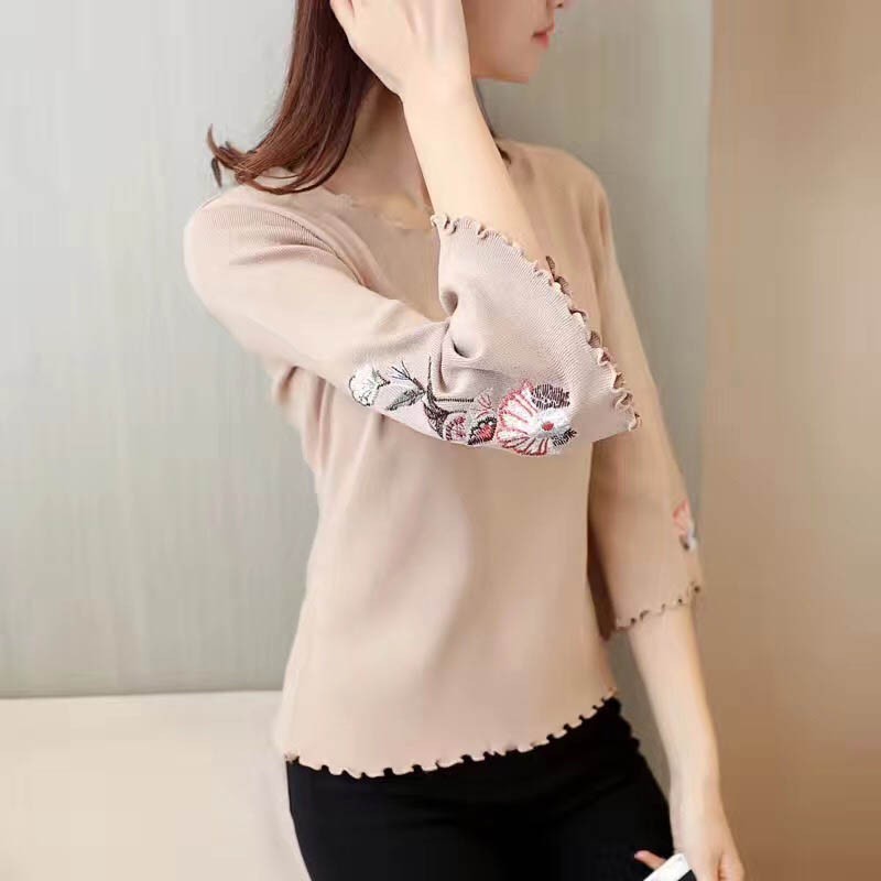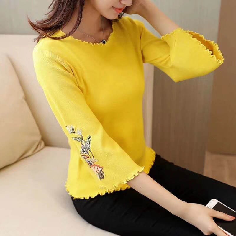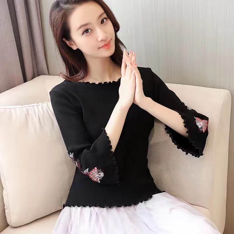 【入荷後営業日2,3日以内出荷予定 通関待ちや不良により出荷遅くなる場合はメールにてご連絡いたします。メール受信設定によっては正常に受信されない場合はございますので、 弊社からのメールを予め受信頂くようご設定くださいませ。】 トップス ニット 薄ニット ラッパ袖 ラウンド襟 ショート レディス レディース 春 新作 2018フラワー刺しゅうラッパ袖ニットトップス◆素材:ポリエステル
