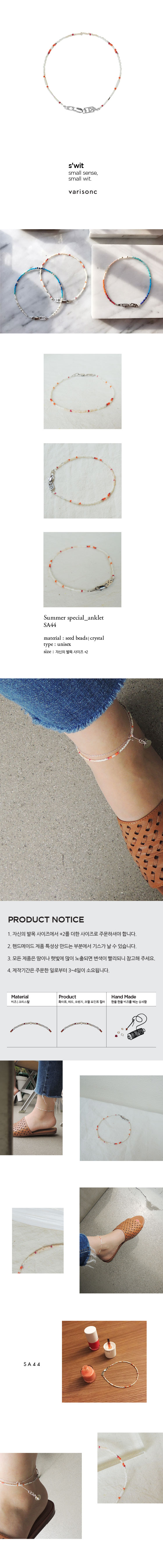 - 주문시 유의사항 : 모든 제품은 핸드메이드이므로 약간의 오차가 발생될 수 있습니다. 모든 금속제품은 시간이 지남에 따라 자연스럽게 변색 됩니다. 제작기간은 2~3일 정도의 시간이 소요되며, 제품의 부자재 유무에 따라 최대 5일까지 소요되는 경우도 있습니다. - 제주 및 도서산간 지역은 추가배송비(3,000원)가 부과됩니다. 새롭게 개발된 발찌는 가벼운 착용감으로 더운 여름에도 부담스럽지 않고 데일리 아이템으로도 손색이 없습니다. 발목을 더 돋보이게 할 포인트 아이템입니다. 화이트 비즈와 레드, 오렌지, 코랄 포인트 컬러로 더욱 시원해 보이는 발목을 드러낼 수 있는 데일리 발찌입니다.