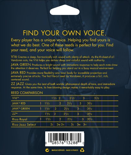 Vandoren SRMIXS25 Soprano Sax Jazz Reed Mix Card includes 1 each ZZ, V16, JAVA and JAVA Red Strength 2.5