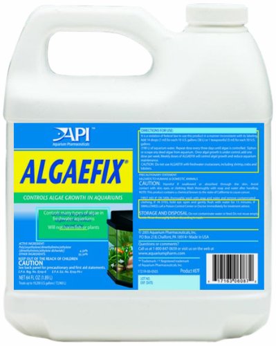 A revolutionary product specially developed to control many types of algae in freshwater aquariums containing live fish and plants. Effectively controls green water algae blooms. Keeps freshwater aquariums clean and clear. Weekly doses of Algaefix will control algae growth and reduce aquarium maintenance. Algaefix is a liquid algae-control product for use in ornamental fishponds, water gardens, fountains and freshwater aquariums. Algaefix is specially formulated for use in ponds and aquariums containing live plants and fish. Algaefix controls many types of algae, including green water" blooms and filamentous algae. Algaefix is colorless and non-corrosive. Algaefix can be used in freshwater aquariums containing live plants and fish. Do not use with crustaceans including crabs shrimp and freshwater lobsters."Feature