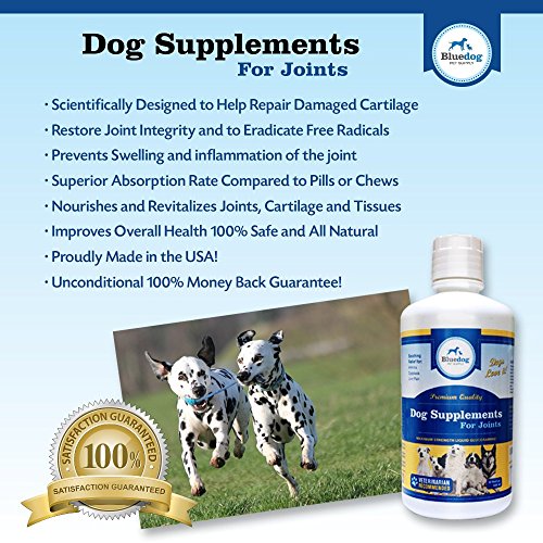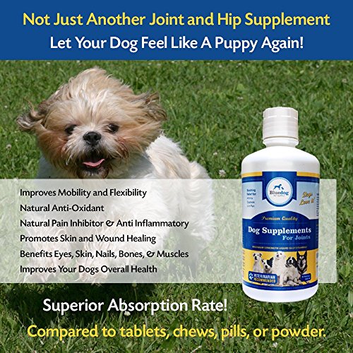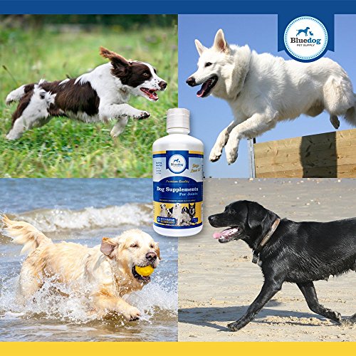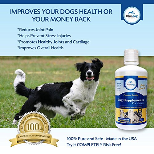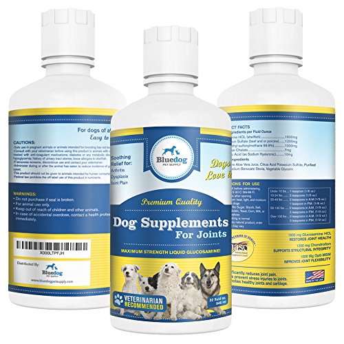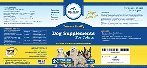 The Best Liquid Glucosamine and MSM for dogs. Dog Supplements for Joints-Premium Quality MAXIMUM STRENGTH Liquid Glucosamine for Dogs. 1600 mg Glucosamine with Hyaluronic Acid, 1000 mg Ultra Pure MSM, and 1200 mg Chondroiton. The best "dog supplements for joints" and hips. Liquid Joint Supplements for Dogs absorb better than chewables or powders-Maximum Strength Hip and Joint Health Support for Large and Small Dogs. Arthritis and Dysplasia relief - Ease your dog's pain and stiffness, while increasing comfort and flexibility with our liquid glucosamine. Dogs love it! Recommended for dogs of all ages, sizes, breeds, and activity levels! 100% Satisfaction Guaranteed! - Made in the USA!