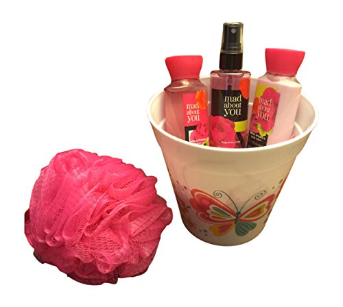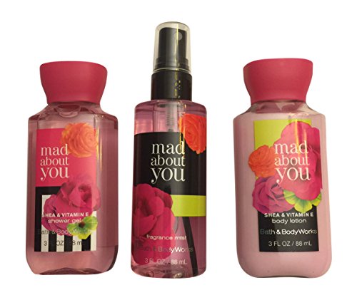 -. Feature : Enjoy all 3 steps of the Mad About You Daily Trio: super lathering Shower Gel (3 oz.), Body Lotion (3 oz.), and skin-loving Fragrance Mist (3oz.) / Makes an excellent gift for any occasion / Subtle, lovely fragrance is a love-struck pairing of soft peonies & black currant kissed with creamy vanilla musk / Share some happiness with this thoughtful gift set / Includes 3oz travel size shower gel, body lotion, and fragrance mist with 5" bath pouf and 6" decorative container
