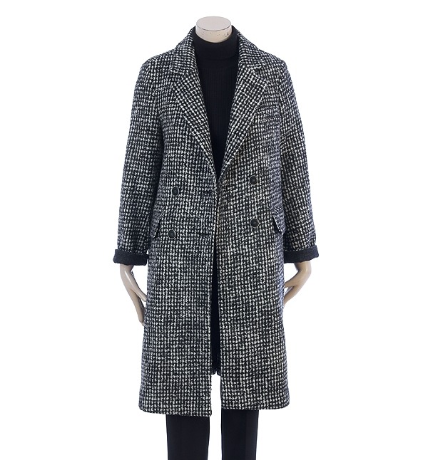 CC collect, 클래식한 체크패턴으로 세련스러운 스타일 감각을 연출하는 더블버튼 모직롱코트입니다