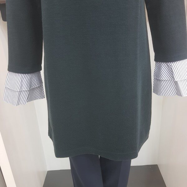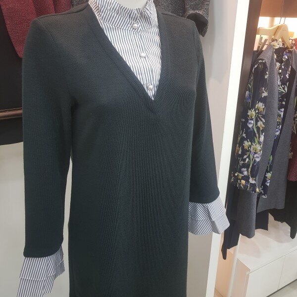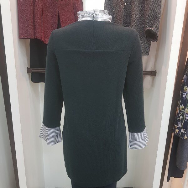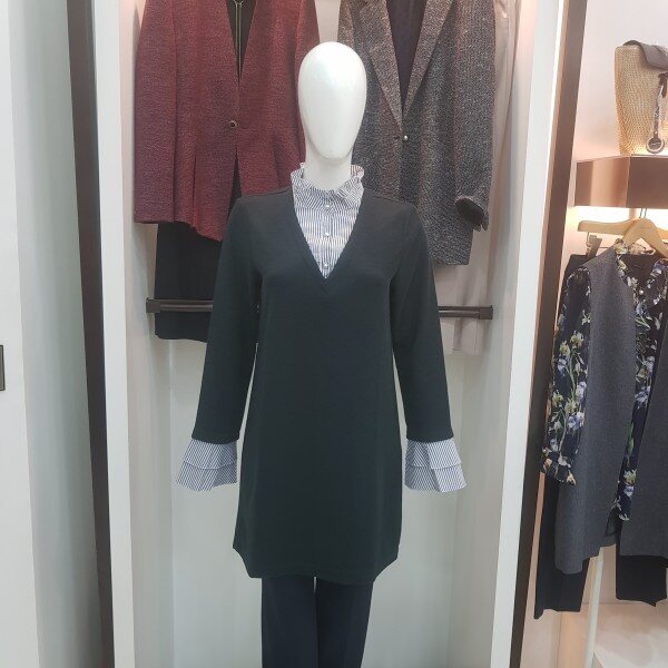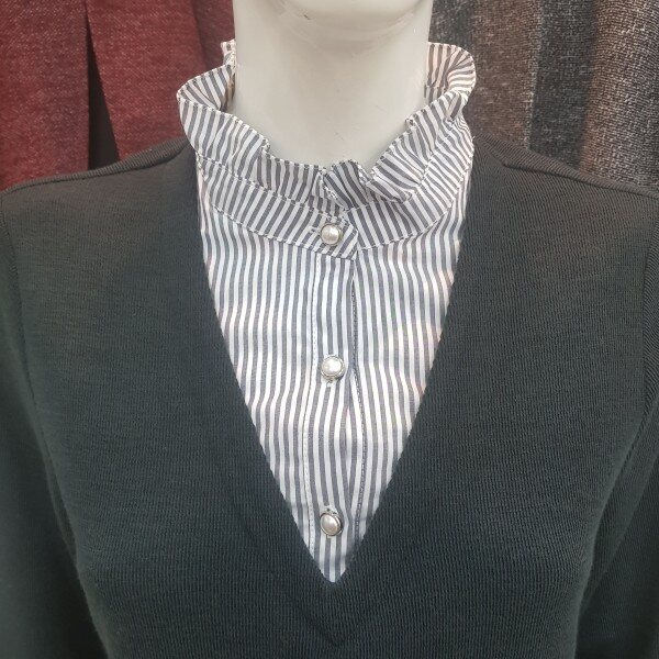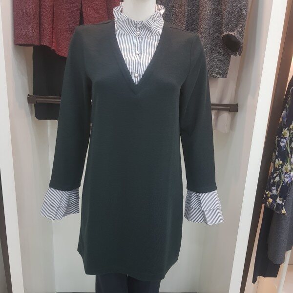 네크와 탈착 소매의 프릴에 셔츠를 레이어드한 느낌의 티셔츠