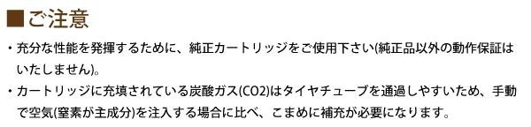 | 仕様 | スポーツ自転車用 適合タイヤバルブ:フレンチ(仏式)・シュレッダー(米式) エアゲージ付両用ポンプ:自動・手動 チャージ目安/CO2カートリッジ:1秒・手動式ポンプ:60秒 【充填気圧】 ●CO2カートリッジ使用時 MTB(26×1.95):Bar3.5/Psi50 ROAD(700×20C):Bar8.2/Psi115 ●手動注入時(約60秒間ポンピング) MTB(26×1.95)Bar2.0/Psi30 ROAD(700×20C)Bar3.5/Psi50 |