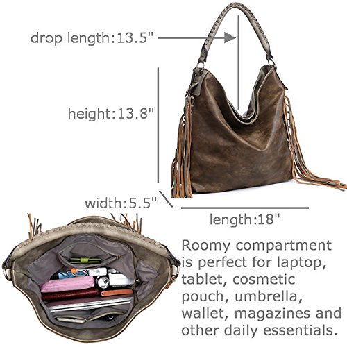 -. Feature : Material for this fringe purse: soft hand feel and durable vegan leather, faux synthetic PU material; well polished light gold color hardware / Dimension for this fringe hobo: 19" x 14.3" x 6", fit laptop, tablet, spacious and roomy compartment; handle drop 13.5" / Structure for this shoulder bags: 1 main compartment; top zipper closure; 2 interior slip pocket for cell phone and cards; 1 interior zip pocket for wallet; 1 adjustable and detachable long strap / Capacity for this shoulder purse: the spacious compartment is roomy and big enough to hold laptop, macbook, tablet, cosmetic pouch and other essentials, and you can carry this bag in most occasions, such as shopping, office, work, campus, travel, day trip / Feature: Stylish and trendy fringes on both sides; braided whipping handle