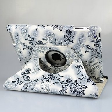 Ultra Stylish (Black/white) Embossed Flowers Case With 360 Degrees Rotating Swivel Stand for Ipad 3 / The New Ipad (3rd Generation) /Ipad 2 , Supports Smart Cover Wake/sleep Function