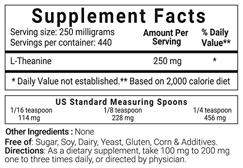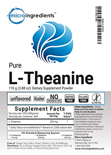 Micro Ingredients L-Theanine Powder. 100% pure, vegan, no additives or preservatives, fillers free, non-gmo, gluten-free, no artificial colors or flavors.