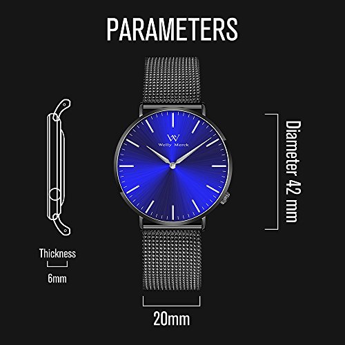 Every Welly Merck watch is outfitted with a Swiss Ronda 762 quartz movement. Sapphire Crystal Glass make the watch hard and durable. Stainless Steel 20mm Width IP Plating Mesh Strap. 42mm Diameter and 6mm Thickness stainless steel case. 5 ATM waterproof watch.