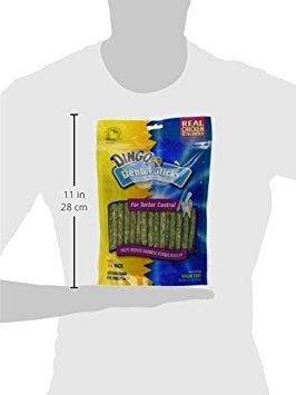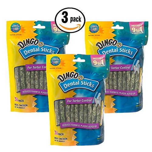 -. Binding : Misc. -. Brand : Dingo -. EAN : 0791435357448 -. Feature : Dental sticks offer the same great taste as Dingo's Original Munchy Stix plus added freshness of baking soda and parsley seed / The irresistible flavor of real chicken inside each stick gives your dog a delicious treat, while the chewing action gives teeth a thorough cleaning by removing tartar and plaque build-up / Teeth cleaning dental sticks with real chicken (as the main ingredient) in the middle / Dog's natural chewing action of dingo dental sticks scrubs your dog's teeth clean while massaging gums for good oral health and fresher breath / Three Pack Bundle Includes 30 sticks per pack for 90 total dental sticks. -. Label : Dingo -. Manufacturer : Dingo -. PackageQuantity : 1 -. ProductGroup : Pet Products -. ProductTypeName : PET_SUPPLIES -. Publisher : Dingo -. Studio : Dingo -. Title : Pack of 3 Dingo Dental Sticks Rawhide Dog Treats - 90 Total Sticks -. UPC : 791435357448
