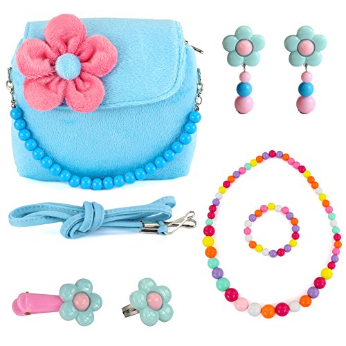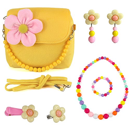 VALUE FOR MONEY - Its absolutely adorable and for the price, its well worth it.Includes 1 handbag, 1 pair of clip-on earrings, 1 flower ring, 1 flower hair clip, and a set of matching colorful beaded necklace and bracelet.