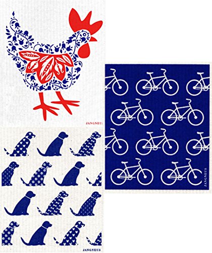 Swedish Dishcloth, (JF) Set of 3 BLUE with Hen, Dogs, Bikes