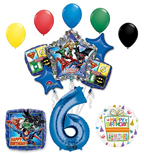 -. Feature : (1) 34" Justice League Star Shape Foil Balloon / (2) 17" Justice League Foil Balloons, (1) 17" Justice League Birthday Foil Balloon / (1) 34" Giant Blue Number 6 Balloon / (1) 18" Birthday Present Balloon, (2) 19" Blue Star Foil Balloons / (5) 11" Qualatex Latex Balloons 1 each of Red, Yellow, Blue, Green and Black