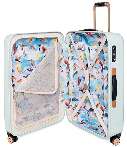-. Feature : Two-way zip-around closure / Interior mesh sleeve; elasticized straps / Four smooth-glide spinner wheels / TSA-approved combination lock / Rose gold tone detailing and scripted Ted Baker branding