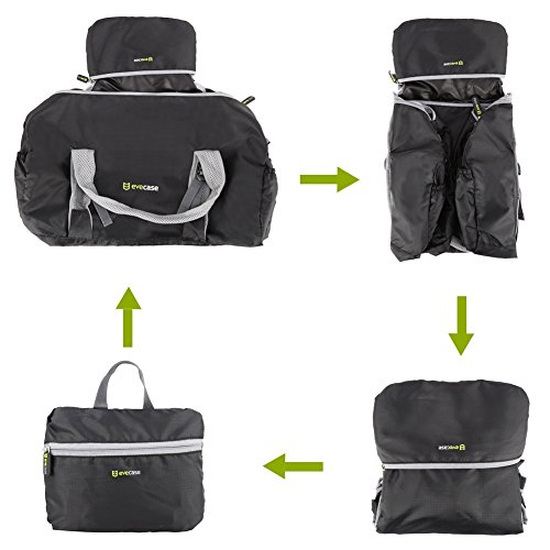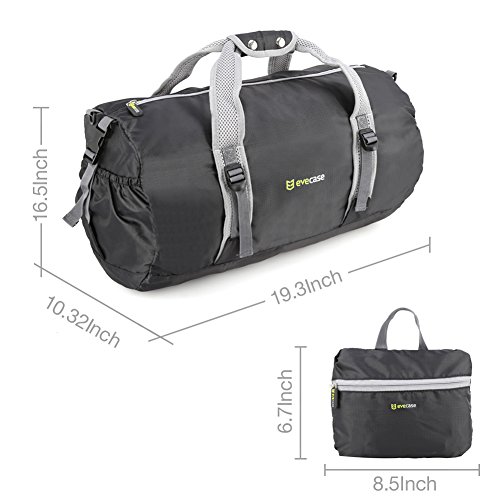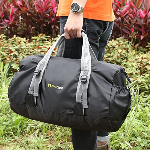 -. Binding : Misc. -. Brand : Evecase -. Feature : Evecase Lightweight Packable Travel Lage Duffle Bag for for Gym, Sports, Travel, or Emergencies. Duffle Bag Dimensions: 19.3 x 16.5 x 10.3 inches. / Light weight and compact design 9.4 ounces, folding size 8.75 x 7 inch. Can be folded and kept in larger bags, lage, bug bags, or emergency kits. / Reinforced padded breathable mesh hand straps for comfortable carry. Extra reinforced straps on side pockets for bulkier item carry. / Water resistant nylon material to keep interior items safe from light rain or water splashes. Keep items dry and secure. / Plenty of storage that can be used to carry gym clothes, extra shoes, equipment, souvenirs, gifts or have extra emergency storage for life's unexpected events. -. IsAutographed : 0 -. IsMemorabilia : 0 -. Label : Evecase -. Manufacturer : Evecase -. ProductGroup : Sports -. ProductTypeName : SPORTING_GOODS -. Publisher : Evecase -. Studio : Evecase -. Title : Evecase Lightweight Packable Travel Lage Duffle Bag For Sports, Gym, Vacation