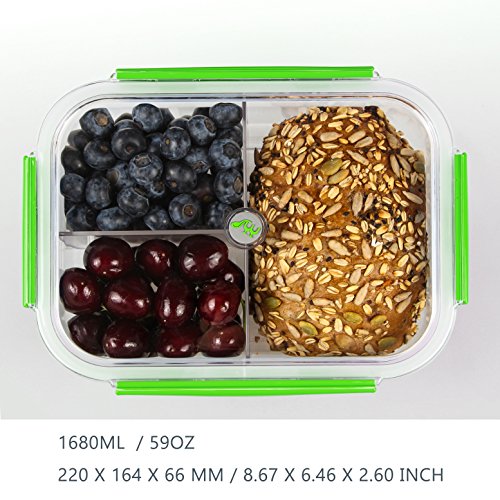 Food Storage Container, Plastic Tritan Meal Prep Container 3 Compartment Airtight Food Container, Bento Lunch Box, Lunch Container, BPA-Free, Microwave, Freezer, Dishwasher Safe [ 59oz, Green]