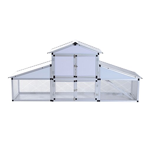 Specifications: ? Color: Grey ? Material: Alluminum alloy ? Overall Size: 100.5¡±L ¡A 45.7¡±W ¡A 29.4¡±H ? Main House: 35.3¡±L ¡A 29.4¡±W ¡A 17.7¡±H ? Side Nesting Box Size: 30.3¡±L ¡A 29.4¡±W ¡A 28.4¡±H ? Front Door Size: 16.6¡±H ¡A 16.5¡±W ? Tray Size: 32.7¡±L ¡A 26.4¡±W ? Ramp Size: 26.4¡±L ¡A 7.7¡±W ? Run Area Size: 35.4¡±L ¡A 27.8¡±W ¡A 17.9¡±H ? Egg Box Size: 14.0¡±L ¡A 13.0¡±W ¡A 17.3¡±H ? Egg Box Door Size: 11.8¡±L ¡A 11.8¡± ? Net Weight: 176lbs