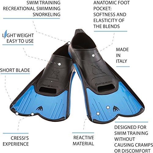 Studio : Cressi Publisher : Cressi Binding : Sports Product Description Cressi fins designed specifically for the pool and for training. The short blade is made from highly reactive and light materials to guarantee agile and not very tiring, but still effective kicking. The length of the blade and the materials used have been studied to enable perfect muscle training, without ever causing painful cramps. The side of the blade is protected by a soft elastomer profile to prevent possible damage to other swimmers. The computer-designed foot is made completely from soft elastomers, and its highly anatomical shape houses the foot with a great degree of comfort, even during long swim sessions. The special conformation of the wide-soled foot makes inserting the foot easy and smooth. These fins have been specifically designed for training and to build up muscles, but they can also be profitably used for snorkeling and swimming, where the small size of the blade makes it easier to enter and come out of the water. 0