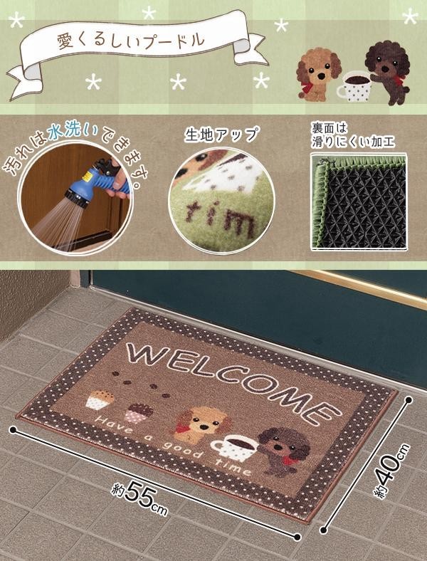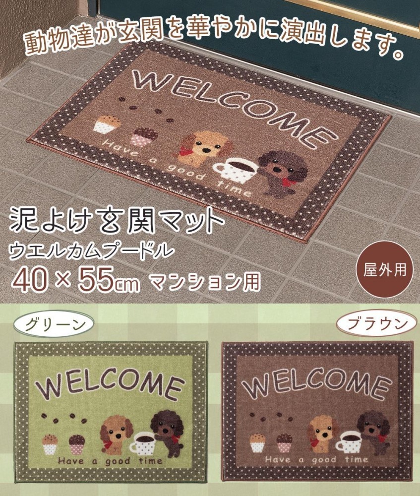 | 落ち着いた色合いと可愛らしいデザインの屋外用玄関マット♪汚れたら水洗いでき、裏面には滑りにくい加工を施しているので横ズレしにくいです。マンションや団地にピッタリサイズ!! |