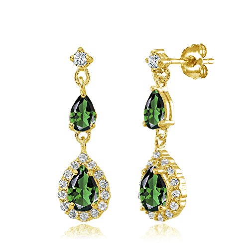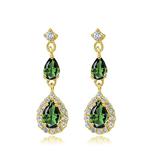 FEATURE - These attractive earrings display pear shape simulated emerald gemstones surrounded by white topaz stones dangling below pear shape solitaire simulated emerald stones. They are attached to single small round white topaz stones. These gemstone earrings in fine jewelry should be an addition to your emerald jewelry and emerald gemstone jewelry collection. They can be purchased as earrings for women, earrings for girls and earrings for teens.