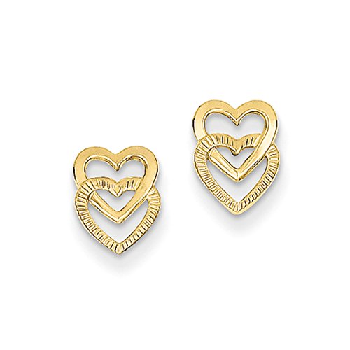 Featuring a stacked heart design with a textured and polished finish, these friction-back post earrings fashioned from 14k yellow gold measure approximately 7mm (1/4 inch) in width by 9mm (3/8 inch) in length. Made in the U.S.A.Feature