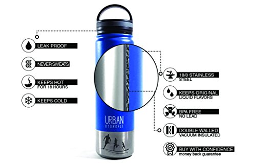 ● ● THE BEST CONSTRUCTION: The sleek-looking URBAN HYDROFIT 22 OUNCE INSULATED Water Bottle is double walled vacuum insulated, keeping drinks cold for up to 24 hours or warm for 18 hours (piping hot for 6 hours); no abrupt temperature change is on the outside of the container while it keeps fluids ultra hot or cold inside; the bottle is sweat-free, so your hands stay dry; keep hydrated at home, work, or play, indoors or outdoors, as it holds hot and cold liquids for a long time;