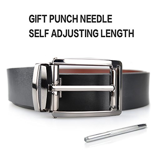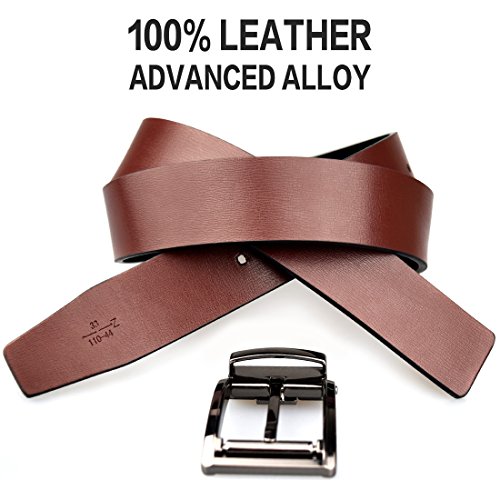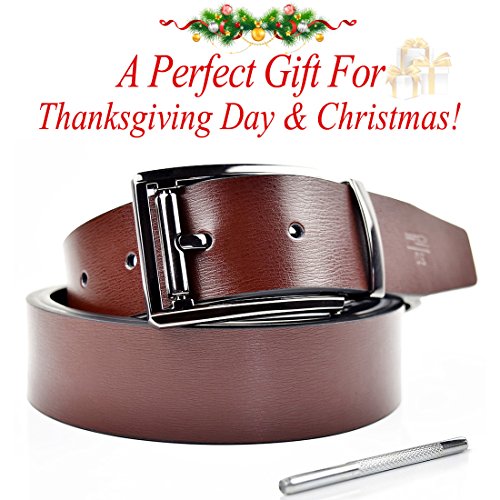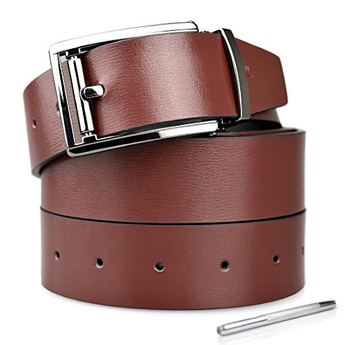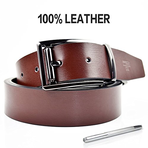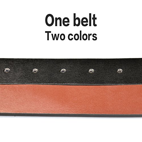 -. Feature : ONE BELT,TWO COLORS - Made of Leather. Width: 1.3". Durable and graceful.Our belt is made of the brown leather and black leather,so you can change the belt color to suit your dress. / DURABLE AND FASHION ALLOY BUCKLE-Suitable for leisure and business style / Full Selection of Sizes - 1.3" wide belt, suitable for size 30-46 waist, plz buy one size larger than your waist / Free Gift punch needle self adjusting length.Exquisite packaging / TRIM AND REMOVE TO FIT - If the belt is too long for you , you can trim the belt length to fit your size. Also, you can change belt colors to match your daily style.