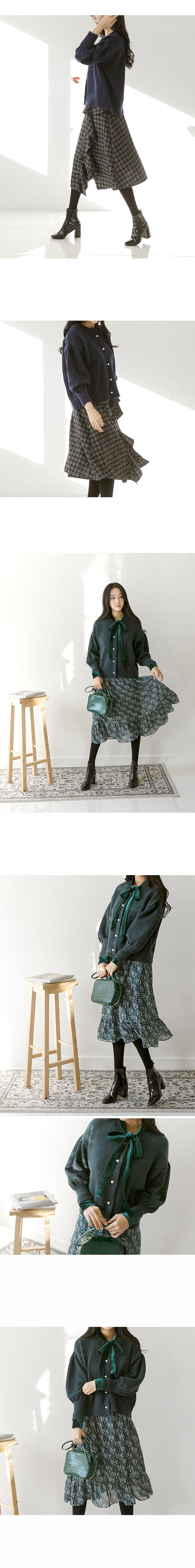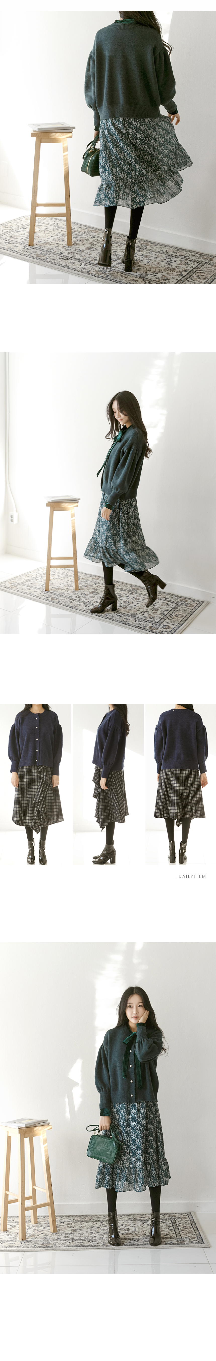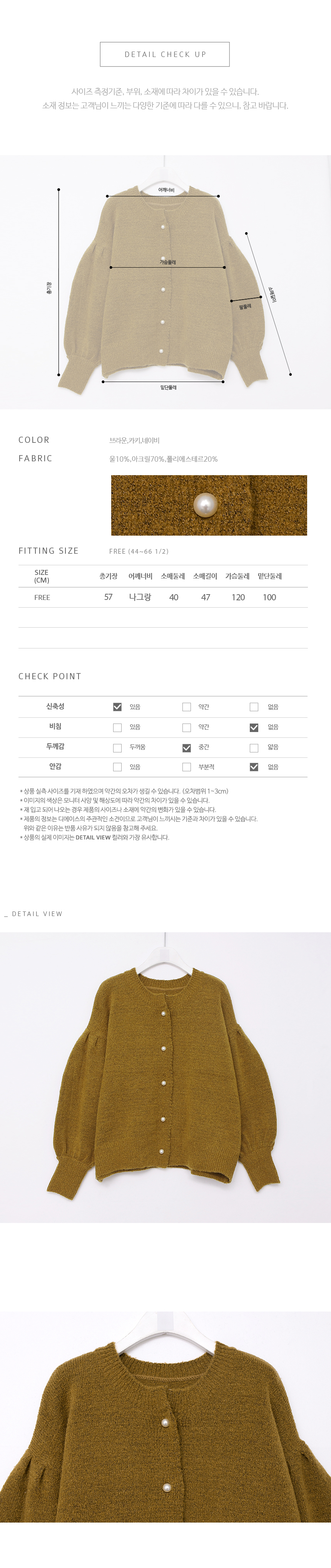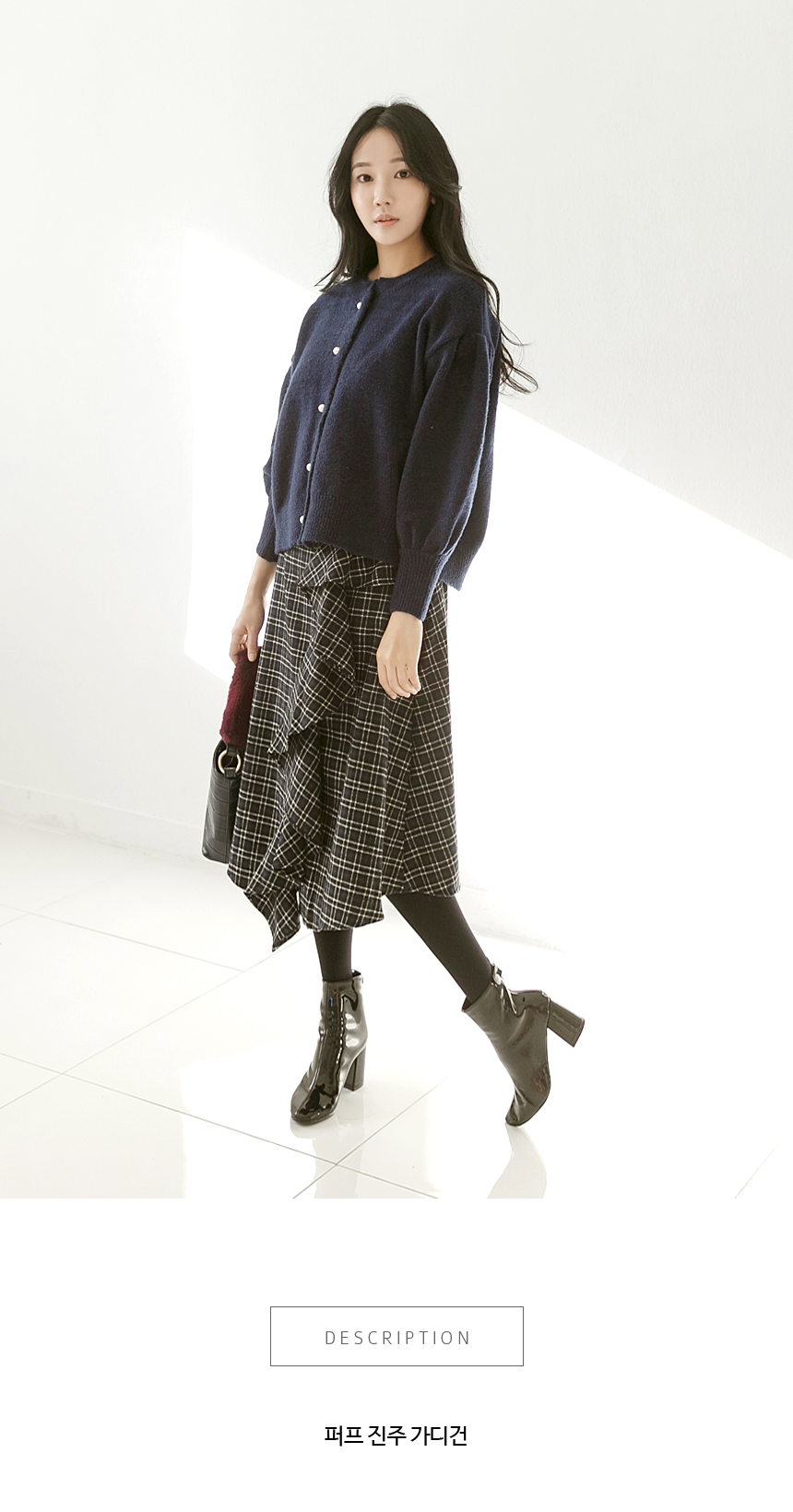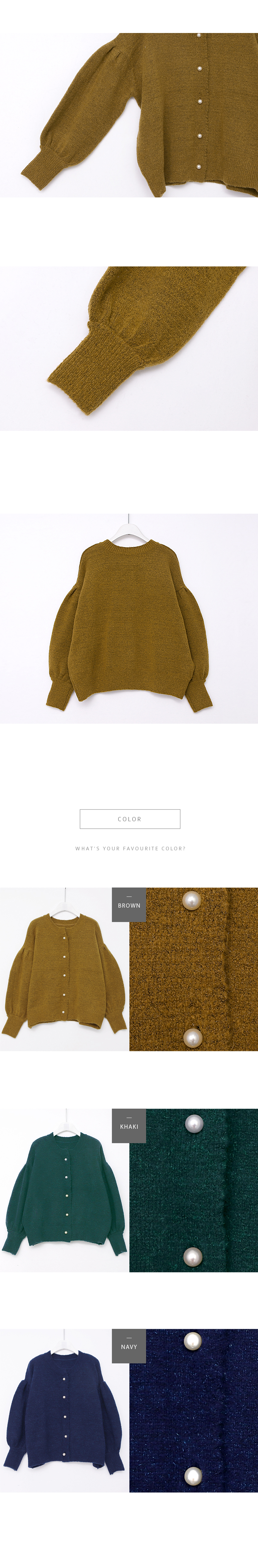 많이 내려온 어깨선에서 둥글게 퍼프지는 소매 라인이 독특한 스타일의 가디건으로 포근한 울 혼방의 도톰한 소재로 보온성까지 좋은 진주 버튼 가디건이에요. 적당히 여유 있는 내추럴 핏으로 단정한 라운드넥에 진주 버튼이 사랑스럽답니다^^ 색상은 브라운, 카키, 네이비 사이즈는 FREE 44~66반 ▼ 관련상품 : 비트 사선프릴 스커트소피 벨벳리본 기모안감 원피스