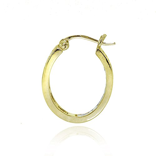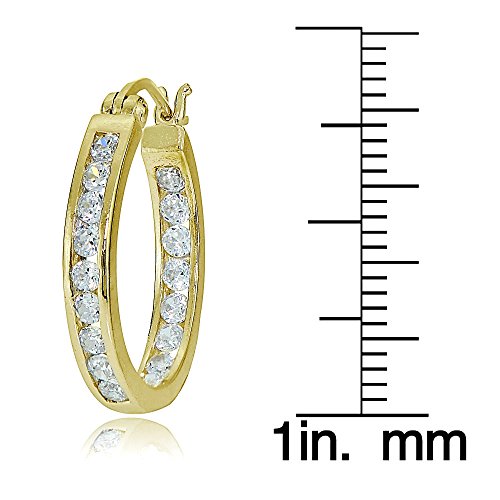 These chic earrings feature sparkling CZ stones, channel-set in 18mm oval Gold Flash sterling silver hoops. The stones are strategically set facing forward on the inside and outside of the hoops, so that they can be seen from the front. The hoops are secured by post with snap-down backs.Feature