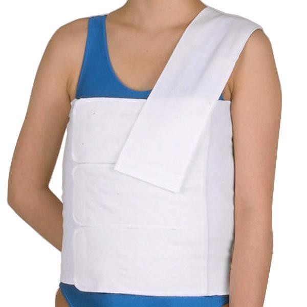 肩ベルトは前部での面ファスナー着脱です。両サイドの伸縮部により軽圧迫が得られ、体動時シワ・ヨレ等もありません。左右兼用です。