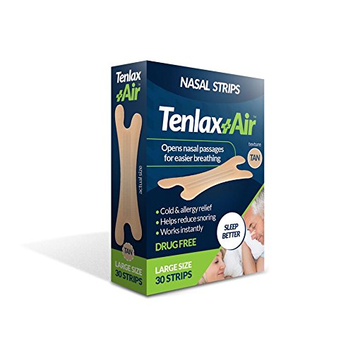 -. Binding : Health and Beauty -. Brand : Tenlax -. Color : Tan -. Feature : Tenlax Air nasal strips open your nose up to 38% more than allergy decongestant sprays alone and can help you reduce or even stop nasal snoring. / Provide relief for nighttime nasal congestion due to cold, allergies, or deviated septum and reduce nasal snoring. / Each Tenlax Air nasal strip is safe to wear for up to twelve hours while sleeping, during the day, or while exercising and playing sports. -. IsAdultProduct : 0 -. Label : Tenlax -. Manufacturer : Tenlax -. MPN : TNS 02 -. PackageQuantity : 30 -. PartNumber : TNS 02 -. ProductGroup : Health and Beauty -. ProductTypeName : HEALTH_PERSONAL_CARE -. Publisher : Tenlax -. Studio : Tenlax -. Title : Tenlax Air Tan Nasal Strips - 30 Count