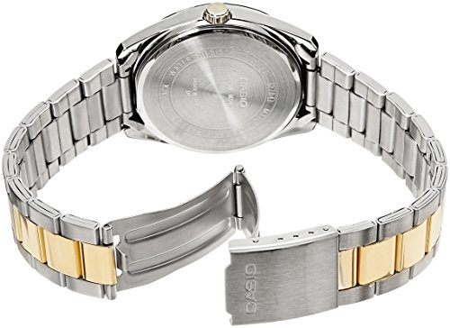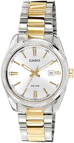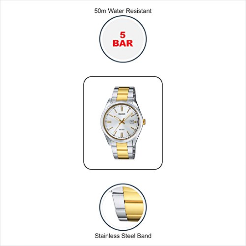 Brand, Seller, or Collection Name:Casio Model number:MTP-1302SG-7AVDF Part Number:MTP-1302SG-7A Model Year:2013 Item Shape:Round Dial window material type:Mineral Display Type:Analog Clasp:Deployment Clasp Case material:Stainless Steel Case diameter:39 millimeters Case Thickness:9 millimeters Band Material:Stainless Steel Band length:Men's Standard Band width:22 millimeters Band Color:Gold-Tone Dial color:Silver-Tone Calendar:Date Special features:Luminous, measures-seconds Item weight:4 Ounces Movement:Quartz Water resistant depth:50 Meters