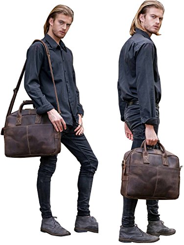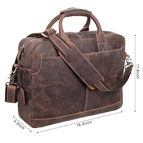 -. Feature : Material: High quality Crazy Horse leather, Retro and Trendy appearance / Dimension:11.8*16.9*4.3inch (L*H*W), Handle approx. 3 inches. / Easy to carry a 15.6 inch laptop in the LAPTOP SLEEVE, the main pocket can accommondate MOST 17 inch / Versatile and Durable for business, Soft Shoulder Strap and Handle for easy, comfortable transport.Pockets of various sizes for accessories / The distinguishing feature of crazy-horse leather is that leather may have wrinkles, scratches that are inherent characteristics . When you scrape it widely, the trace will be appeared .If the trace is not obvious, you can wipe it gently and then the trace will be less