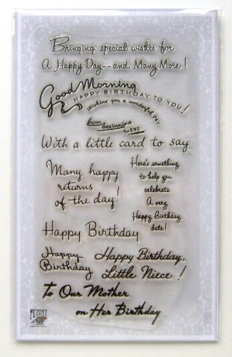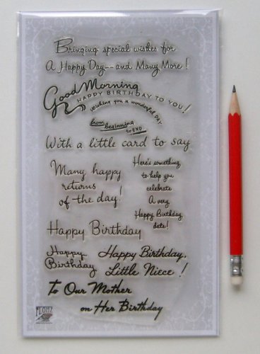 -. Binding : Office Product -. Brand : Flonz -. Color : clear -. EAN : 9464301008157 -. Feature : Stamp sheet measures 4" x 7" (10x18cm). Total over 10 separate stamps. / Made in New Zealand from special last generation photopolymer / Works great with any inks (dye, pigment, oil) and any clays on any surface (paper, fabric or plastic). / Easy to clean without restrictions. / We give lifetime warranty for all our stamps and replace it for a free at any claims. -. Label : Flonz -. Manufacturer : Flonz -. Model : 301-815 -. PackageQuantity : 9 -. ProductGroup : Art and Craft Supply -. ProductTypeName : ART_SUPPLIES -. Publisher : Flonz -. Studio : Flonz -. Title : Happy Birthday Morning (4"x7") Clear Stamps Sheet / Vintage Greetings Wishes Retro