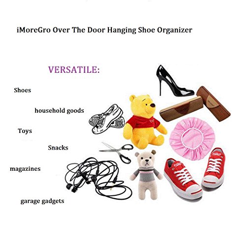 -. Binding : Kitchen -. Brand : iMoreGro -. Feature : Features heavy duty and air breathable fabric,available several fashion colors to complement any d¨¦cor. / 20 roomy pockets designed for durability and maximum storage; allows many different items of different shapes and sizes. / Space saving over the door hanging shoe storage, 3 over-the-door steel hooks make the hanging process quick and easy for any door. / Hold a variety of different items on a door in any room; truly a multi-purpose storage solution. / Measures 17-inches wide x 53-inches long; 24-month worry-free warranty and friendly customer service. -. Label : iMoreGro -. Manufacturer : iMoreGro -. ProductGroup : Home -. ProductTypeName : HOME -. Publisher : iMoreGro -. Studio : iMoreGro -. Title : iMoreGro Over the Door Shoe Organizer, Shoe Storage with 20 Pockets and 3 Over the Door Hooks