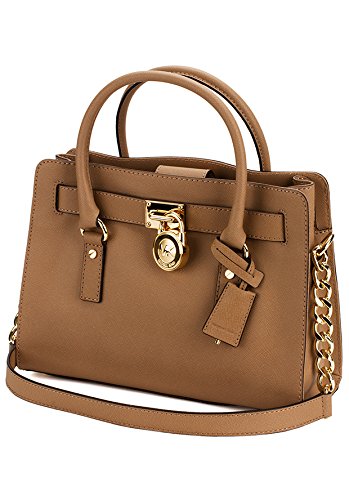 -. Feature : MICHAEL Bag / Saffiano Leather / Gold-tone hardware; signature charm / Double handles with 5" drop; shoulder strap with 11" drop / Interior features zip pocket, 2 slip pockets and key fob