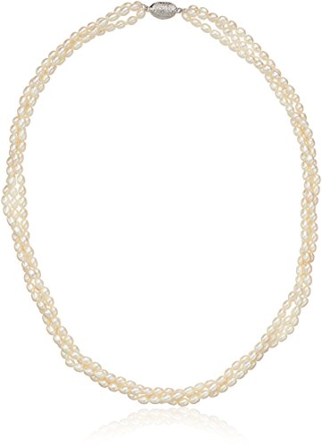 Three Strand White Rice Shape Cultured Freshwater Pearl Necklace featuring Pave Cubic Zirconia Clasp Strand Necklace, 18"