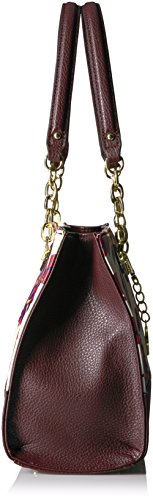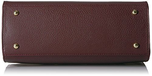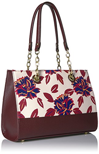 Committed to style and storage, this tote handbag features striking signature hardware, dual top handles with chain detail, and a large inside compartment with additional pockets.